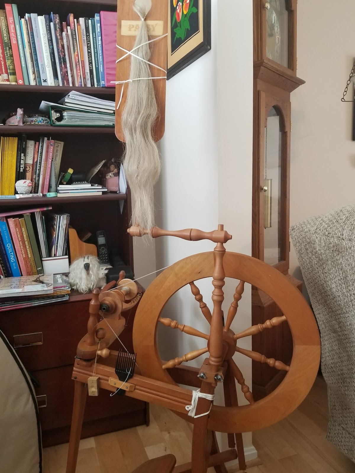 I always keep my fibers under control and prefer to draft the fibers as they move straight down from the distaff. My favorite style of dressing the distaff is the ponytail. This requires a very tall distaff. It is helpful if it is adjustable as you will spin the longest fibers first and over the spinning day you will be working with ever shortening fibers.